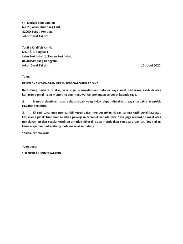 Biasanya kalau kita nak minta kerja mahupun laihan industri melalui email mesti kita akan lampirkan sekali cover letter kepada majikan. Bingkis surat penolakan tawaran kerja sesegera mungkin sampaikan rasa terima kasih berikan alasan jelas gunakan bahasa dan tutur pembukaan yang. Contoh email penolakan tawaran kerja rasmi j cute766.